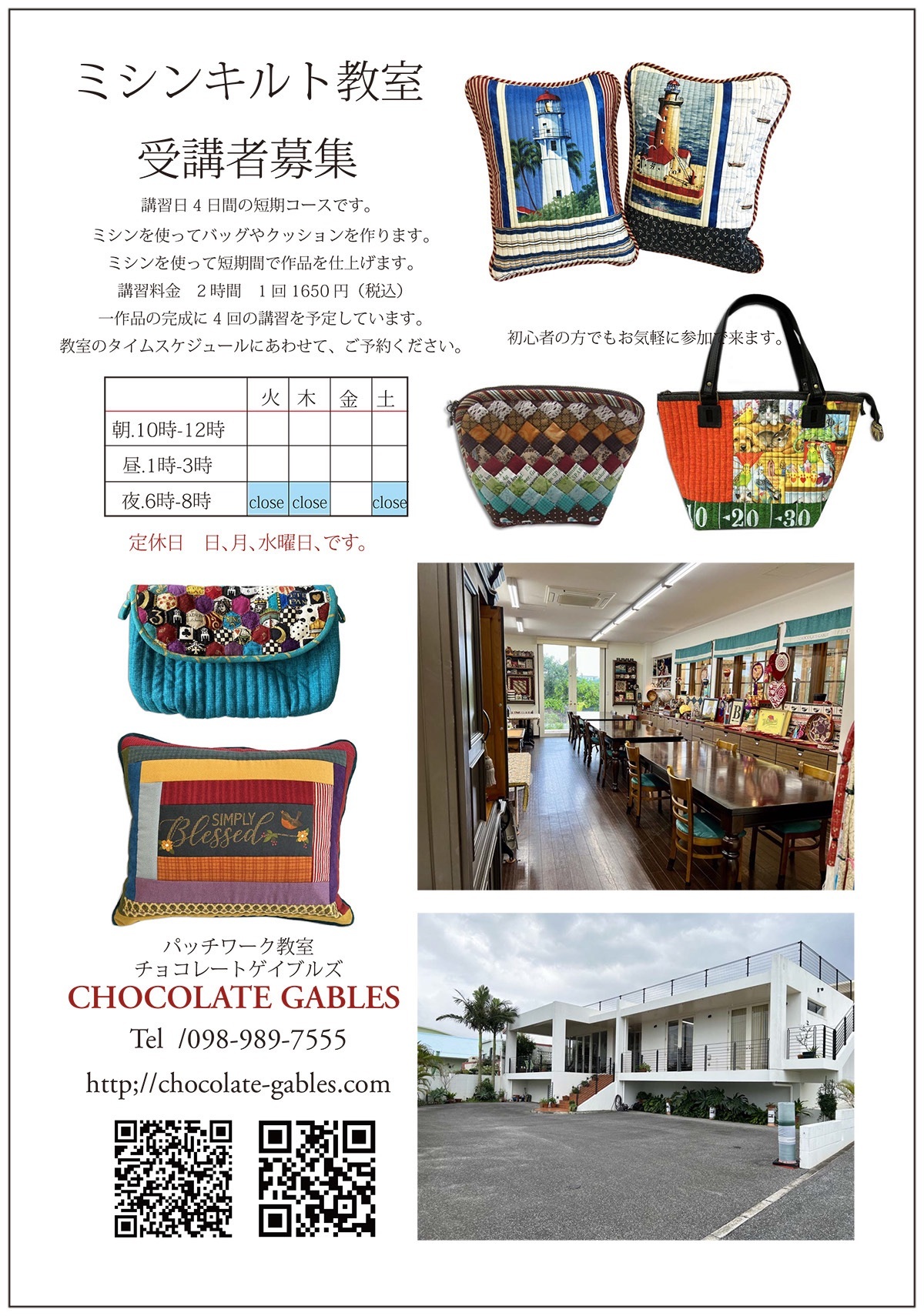 1クラス8人編成のキルト教室15クラスとキルトショップの運営を続けてきました。